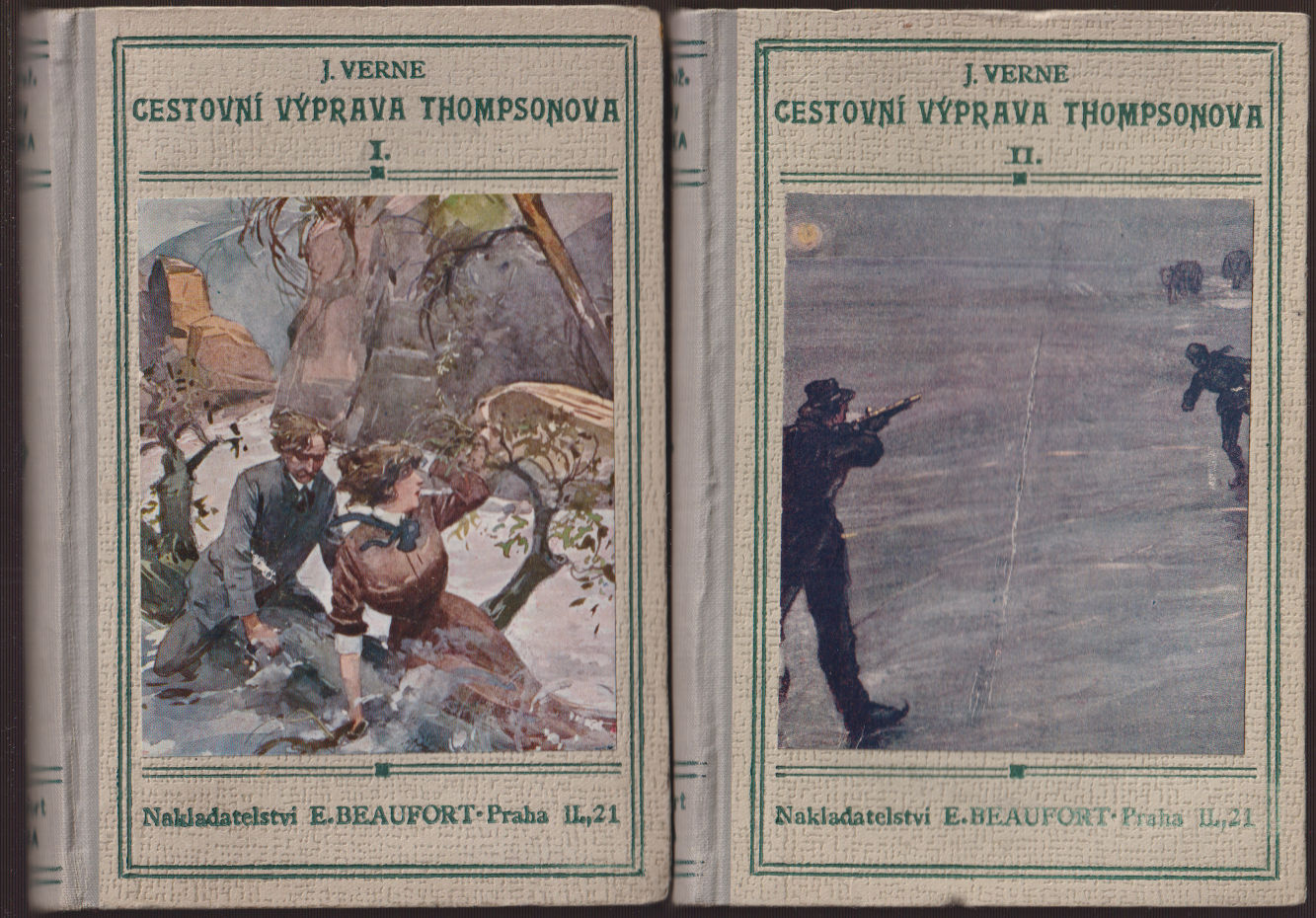 2 svazky, Dobrodružné romány Julia Vernea, vydalo nakladatelství a knihtiskárna E. Beaufort v Praze, nedatováno, překlad Vítězslav Unzeitig, 285 + 279 s., plpl. nakladatelská vazba s nalepenou barevnou reprodukcí, zažloutlé listy, dobrý stav