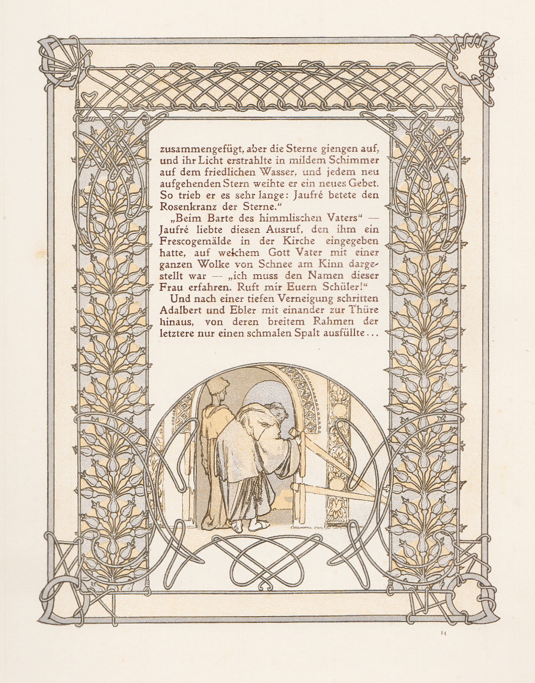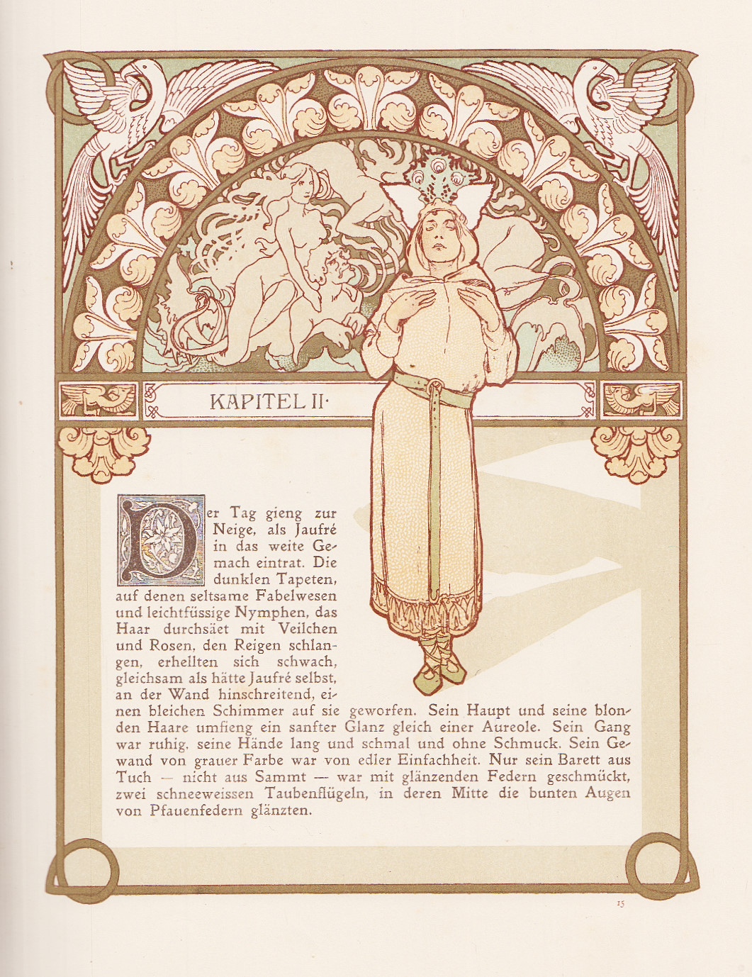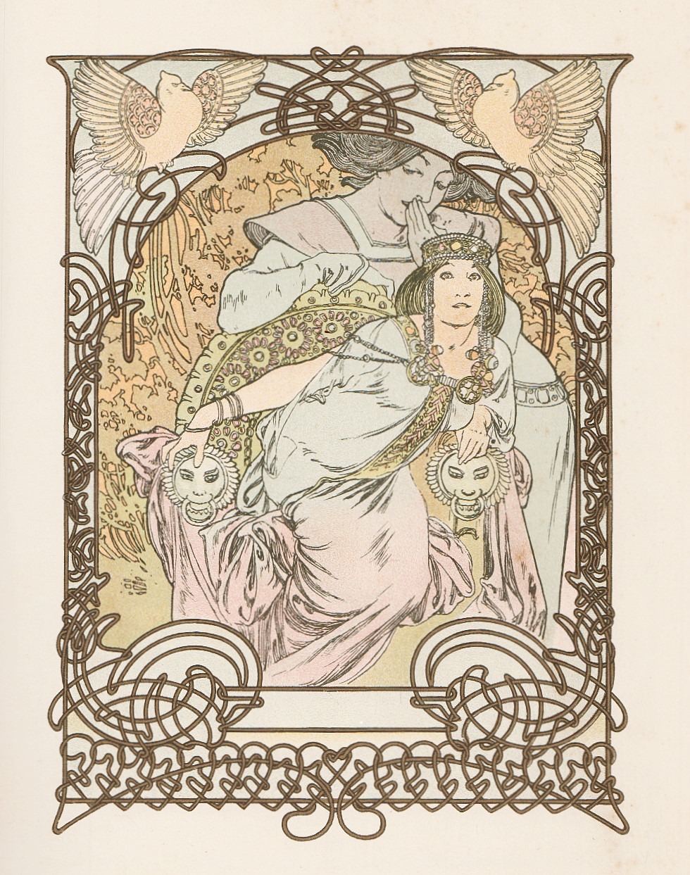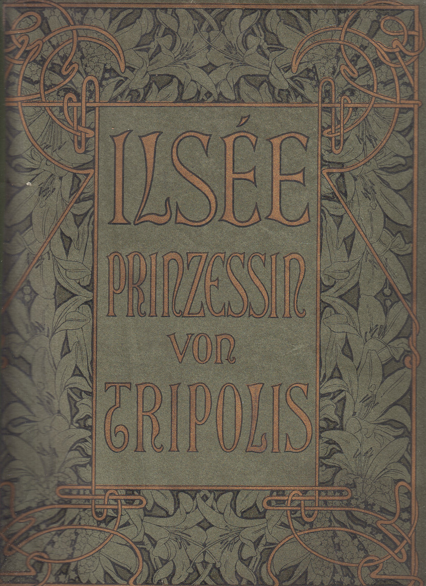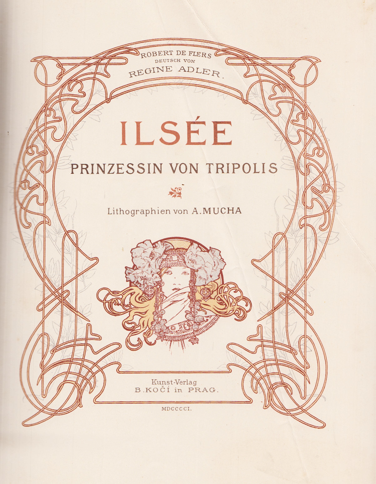 titulní list, návrh vazby, typografické dekorativní kompozice, ilustrace, iniciály, písmo, dekorativní rámce a úprava A. Mucha, Baladu Roberta de Flerse o tripoliské princezně doprovodil Alfons Mucha ilustracemi a navrhl také výtvarnou dekoraci, která uzavírá ilustrace v celek a dává tím dílu jednotnou výtvarnou formu, částem balady předcházejí 4 samostatné celostránkové přílohy, dílo obsahuje 132 stran litografií, vinět a dekorací vše dílem A. Muchy, ražený slepotiskový patitul Alexandre Charpentier, do němčiny přel. Regine Adler, tisk Unie, vydal B. Kočí, Praha 1901, pův. brož, ex. 241/800, 128 s., ochranné desky s nakladatel. reliéfem a zlaceným písmem, kartonové pouzdro se štítkem a číslem výtisku, prvních šest listů včetně titulního listu přeloženo a pošpiněno, hřbet přelepený textilní lepenkou, obálka při krajích pokrčená a míty poškozená, okraje stránek zašpiněné