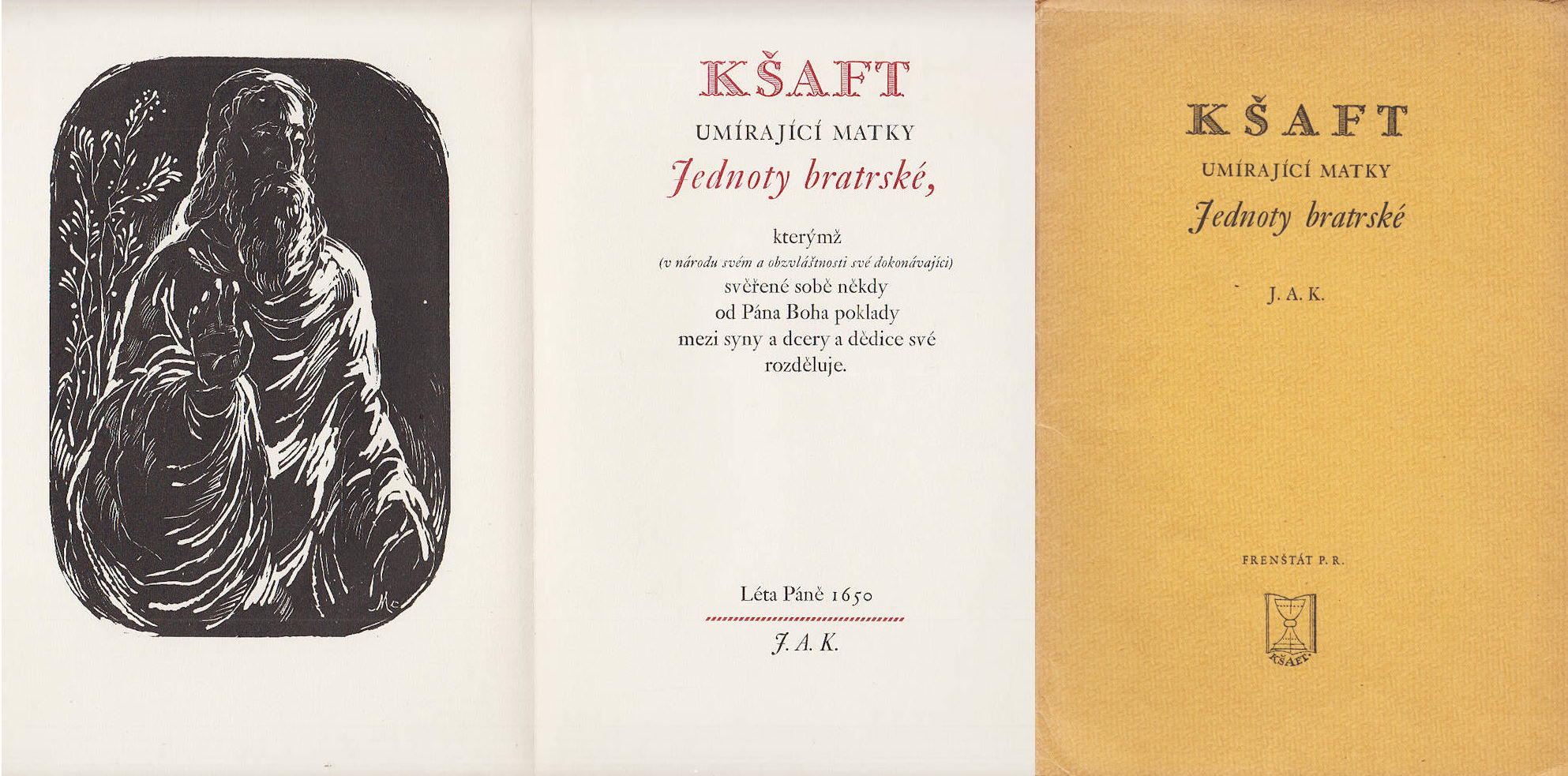 frontispis dřevorytem Ant. M. Machourek, doslov a redakce textu Ferdinand Hrejsa, 2. sv. ed. Kšaft, úprava, tisk a vydání Karel Kryl jako soukromý tisk pro Jana Jelínka, Frenštát p. Radhoštěm 1946, volné listy v papírové obálce, 200 ex., autorský tisk 9/10, OLD Kentucky papír, 48 s., drobně pokrčené okraje obálky, velmi dobrý stav