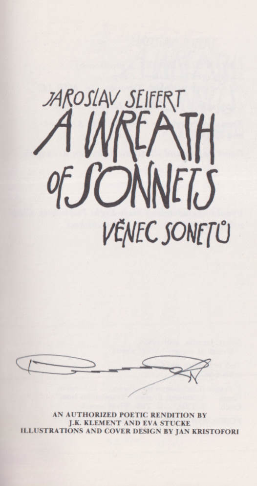 Ilustrace, obálka a podpis na titulu Jan Kristofori, dvojjazyčné česko-anglické vydání Seifertových Sonetů připravili, úvodem opatřili a do angličtiny přeložili J. K. Klement (Václav Pinkava = Jan Křesadlo) a Eva Pinkavová,, 165. sv., vyd. Larkwood Books (divize Sixty Eight Publishers), Toronto 1987, brož, 45 s., velmi dobrý stav