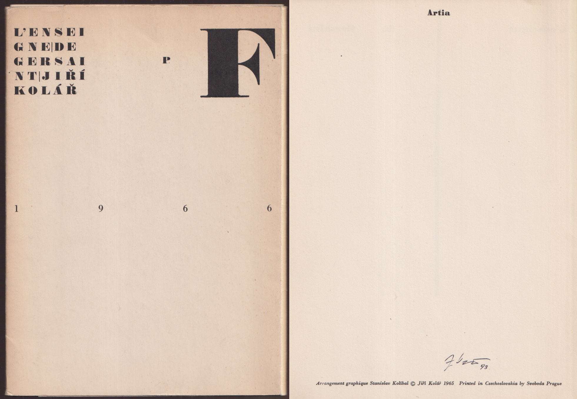podpis v tiráži Jiří Kolář, název Gersaintův vývěsní štít odkazuje na proslulý "reklamní" obraz Antoina Watteaua, Kolář vytváří soubor typograficky koncipovaných autogramů - portrétů světových tvůrců moderního umění, představující pozvánku do nové expozice umění roku 1966, typografie Stanislav Kolíbal, vydala Artia, Praha 1965, volné listy v papírových deskách, velmi dobrý stav