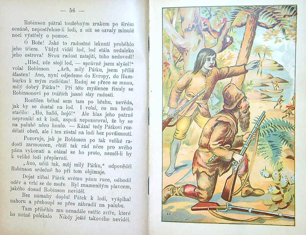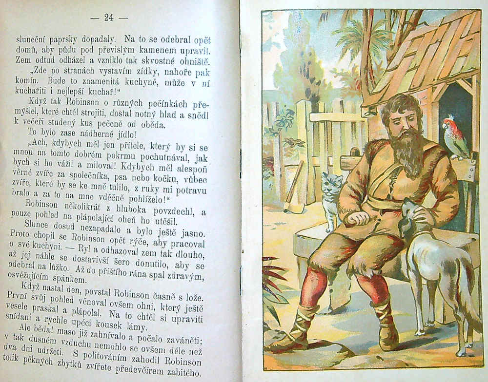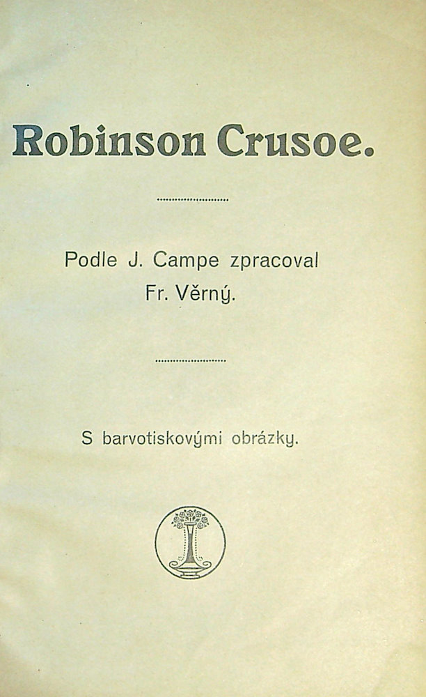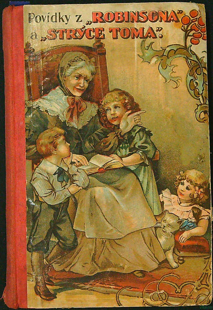 Robinsona podle J. Campe zpracoval Fr. Věrný a Chaloupku strýčka Toma upravil Č. Stránický, 6 barvotiskových ilustrací v přílohách (2 Robinson a 4 Strýc Tom) a barvotisková ob. na deskách, nakladatel neuveden (Alois Hynek?), rok vydání okolo 1890, 86 + 72s., plpl. vazba s nalepenou obálkou, desky při okrajích odřené, zažloutlé listy