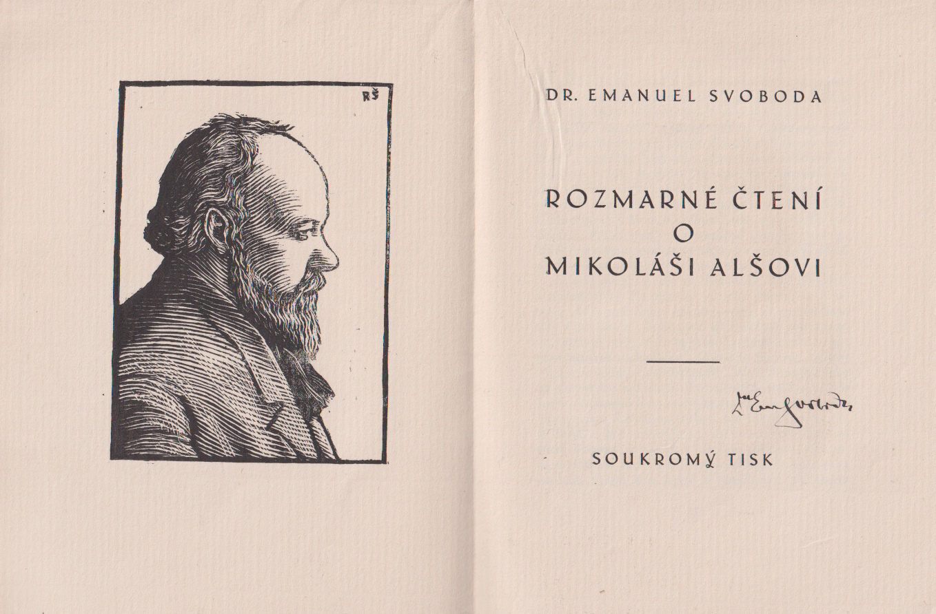 podpis na titulním listu dr. Emanuel Svoboda, podobiznu Alšovu do dřeva vyryl Rud. Švajdler, vydal Jos. Hladký, Hranice 1927, Ex. 19/250, 54 s., brož, lehce zašpiněná obálka, dobrý stav