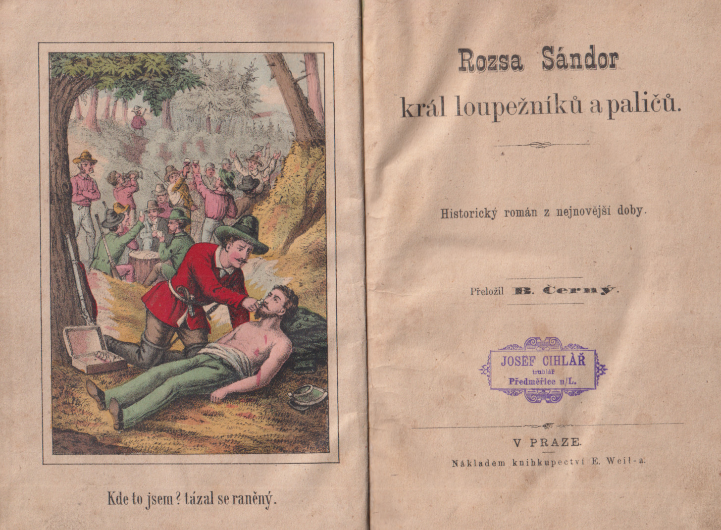 4 x barev. litografie, ve frontispisu a tatáž opakovaně s 2 dalšími v přílohách, dále čb. xylografie v příloze, na přední a zadní předsádce totožná ilustrační rytina s uvězněným hrdinou a s názvem románu, ryl X.A. Řeháček, román o ve své době populární postavě uherského bandity Sándora Rózsy přeložil a zpracoval B. Černý, vydal Nákladem kněhkupectví E. Weil-a, Praha 1870-7, dobová polokož. vazba se zlac. zdobením a nápisem na hřbetu, s. 1263s. (mylně uvedeno 1163s.), velmi dobrý stav, listy zažloutlé, některé listy restuarované, hrany desek odřené