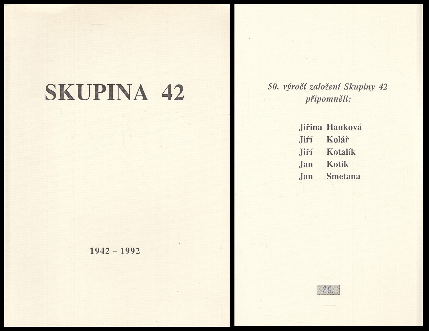 reprodukce děl Jiřího Koláře, Jana Kotíka a Jana Smetany, programová stať Jindřicha Chalupeckého "Svět v němž žijeme" publ. v r. 1940 na vnitřní straně obálky, báseň Jiřiny Haukové, úryvek textu Jiřího Kotalíka ze studie o Karlu Součkovi, vydal MUDr. Jan Vykoukal, Boskovice 1992, volné listy v obálce, ex. 26/50, velmi dobrý stav