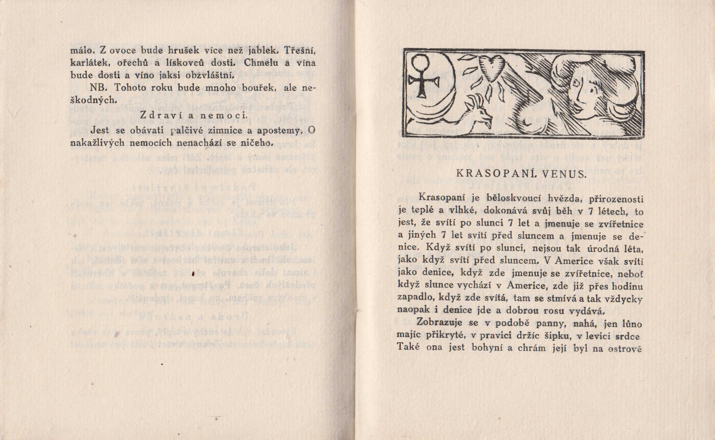 obálka a 7 dřevorytů astrologických planet v záhlaví kapitol Jos. Váchal, vydal Ludvík Bradáč, Praha 1919, brož., nestr. (32), okraje otrhané a poškozené, stav dobrý