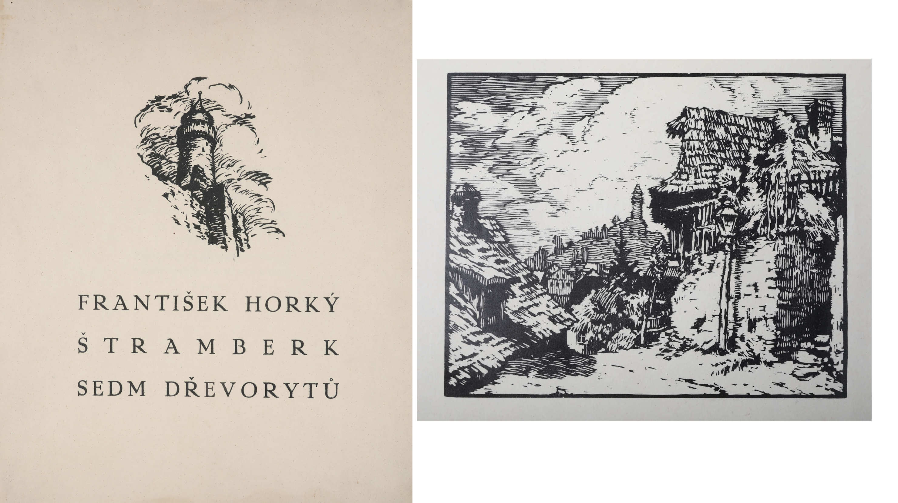 7 dřevorytů na japanu Fr. Horký, doprovodný text J. R. Marek, vydal autor vlastním nákladem, 1921, volné listy v deskách, lehce pokrčený papír