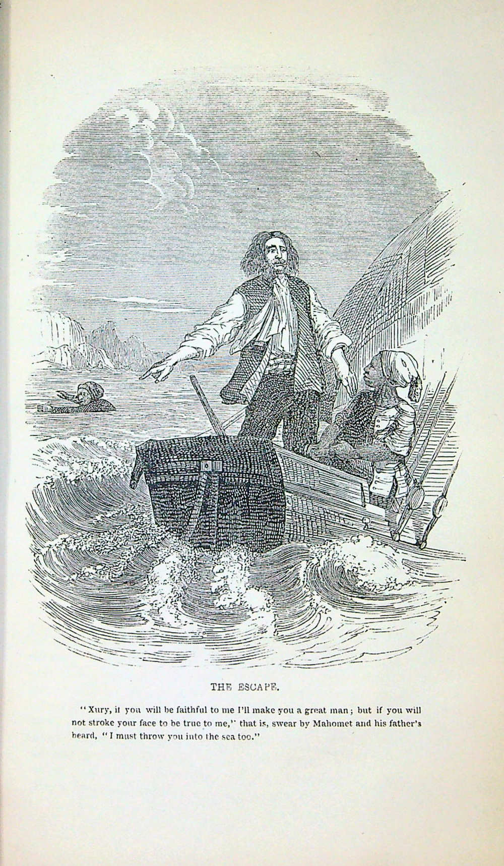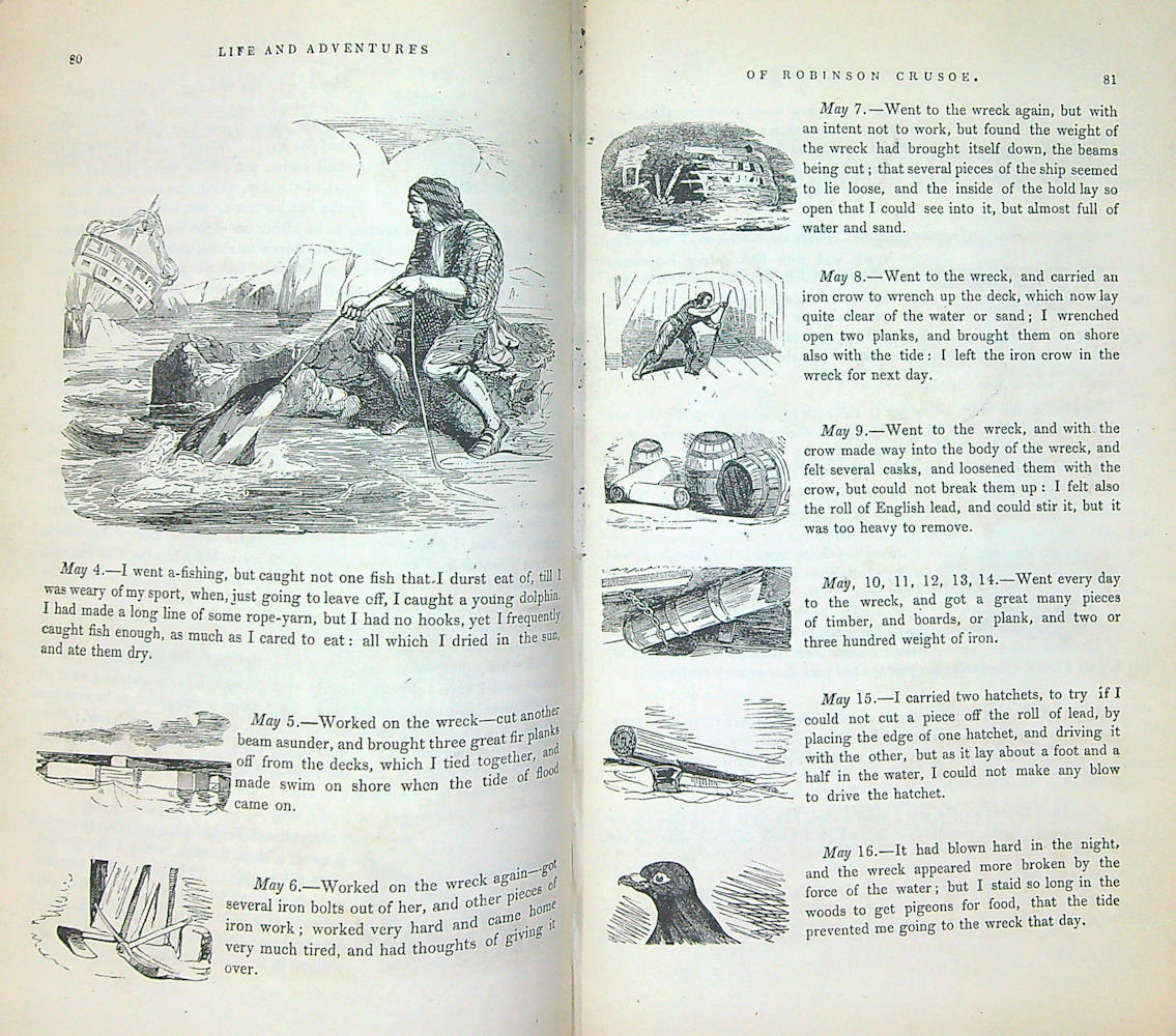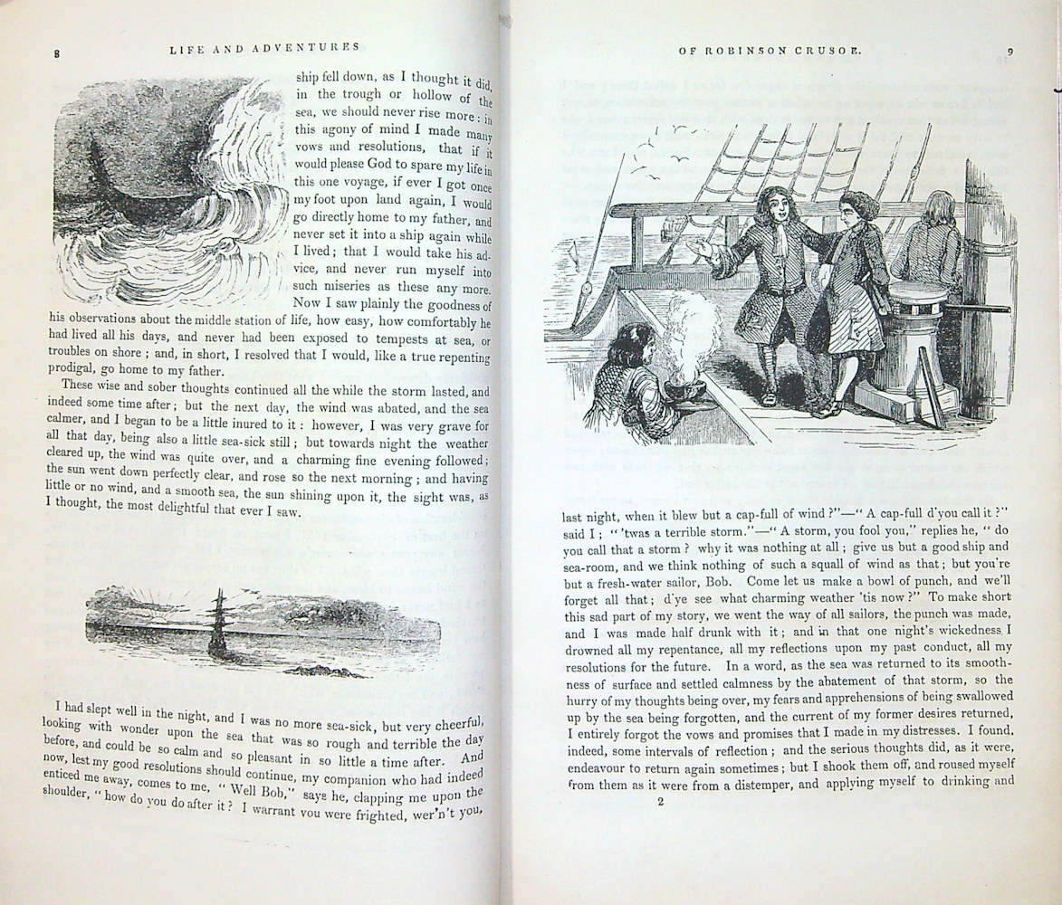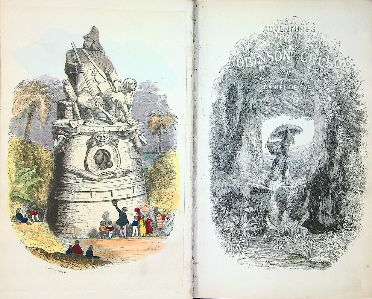 kolorovaný frontispis, ilustrace na titul. listu a četné ilustrace v textu a v přílohách podle kreseb Jeana-Jacquese Grandvillea vyryl do dřeva George Dorrington, obsahuje první i druhý díl Robinsona Crusoe, tisk Willoughby And Co, vydal Willian Strange, Paternoster Row, London 1840, dobová polokož. vazba se zlacenou ořízkou, 486 s., hřbet místy poškozený, rohy a hrany desek místy odřené, vnitřek svazku a stav listů velmi dobrý