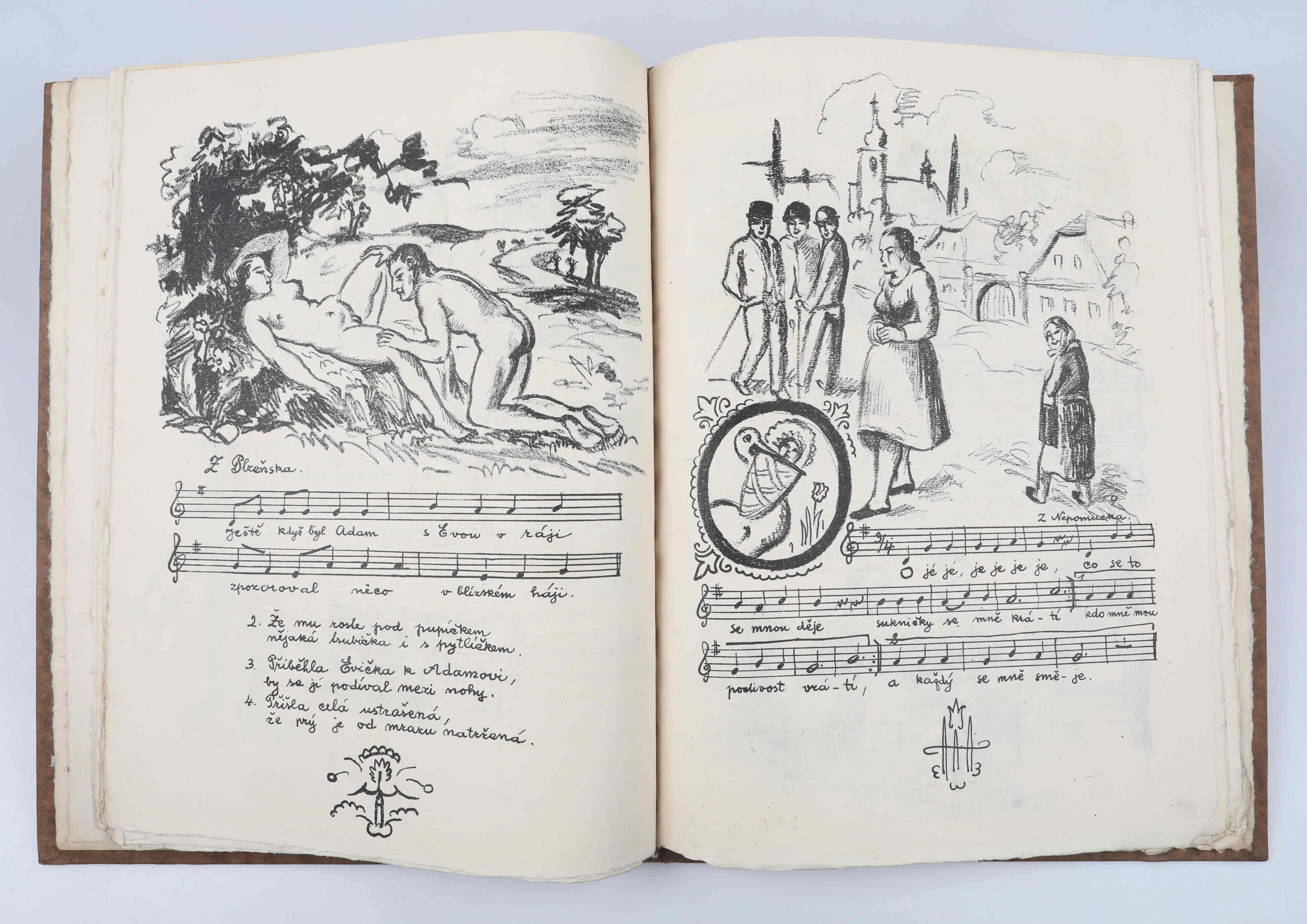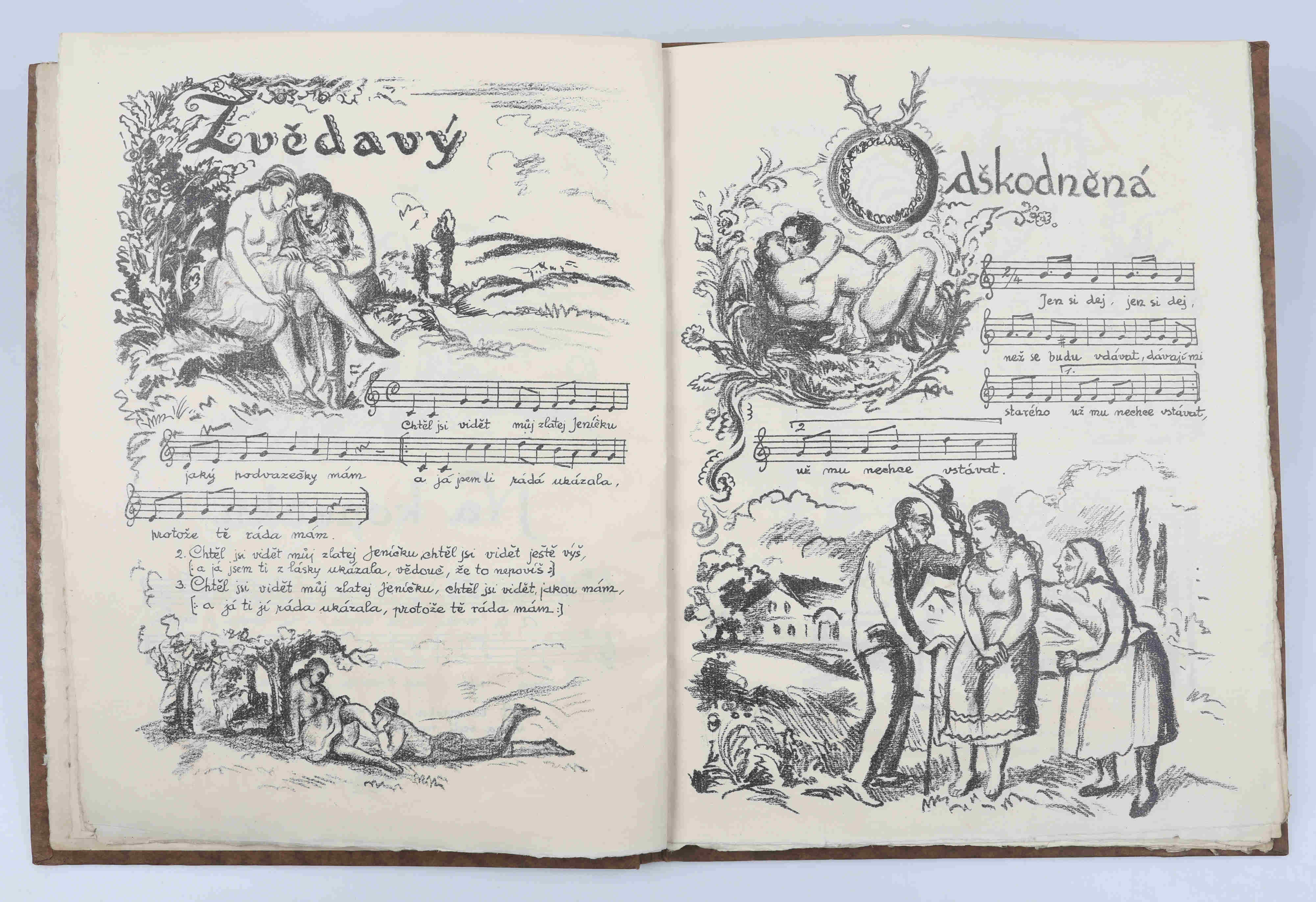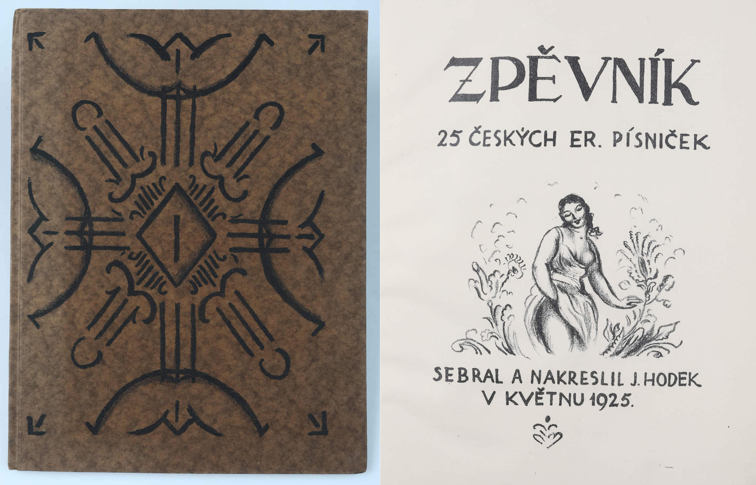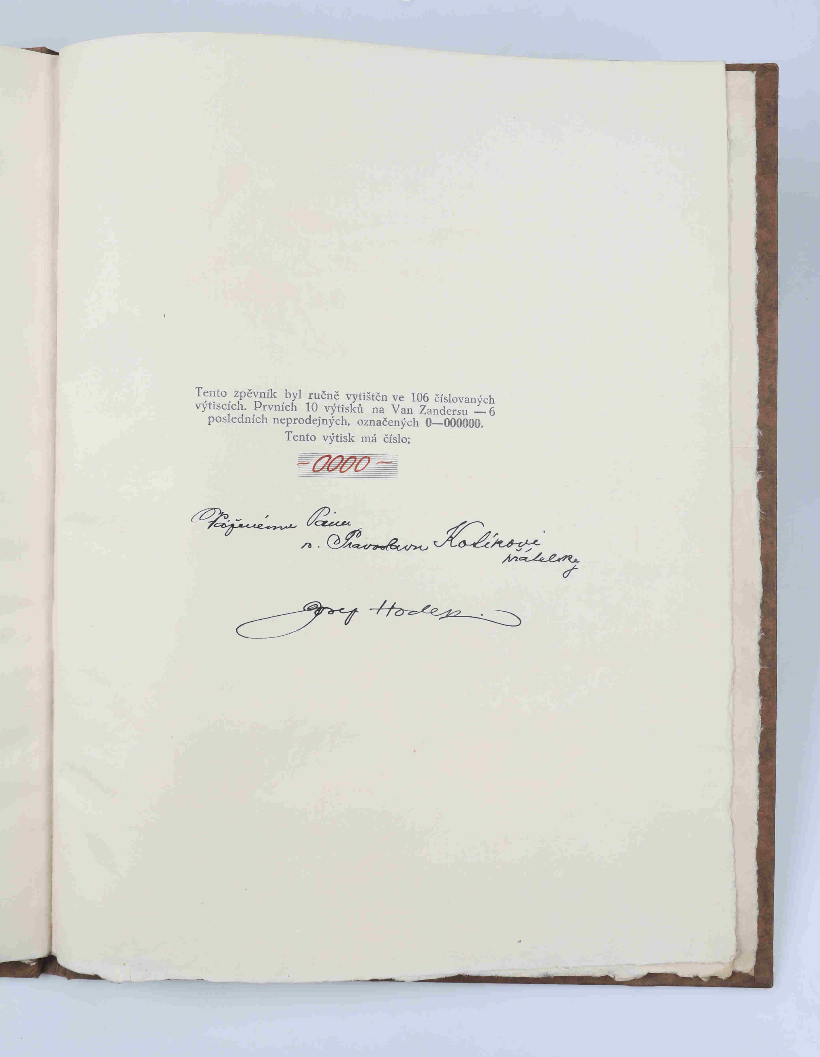 písně sprostonárodní sebral, kresbu na obálce, vinětu v titulu, ilustrace v textu vše litografií vytvořil Josef Hodek, věnování Pravoslavu Kotíkovi a podpis v tiráži též autor, úvodní slovo Frank Wenig, soukromý tisk, 1925, orig. zdobená karton. vazba, neprodejný výtisk č. 0000, celkem ex. 106, nestr. (28 s.), lehce odřená, výborný stav
